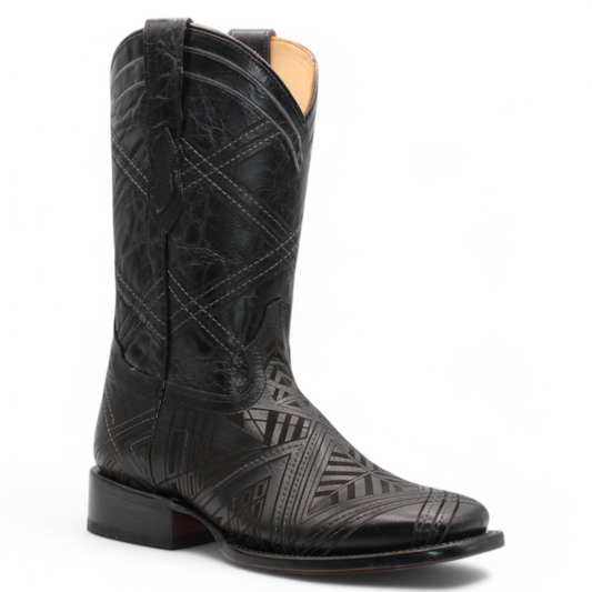 Men’s Square Toe Leather Botin – Laser Engraved Vamp- Black